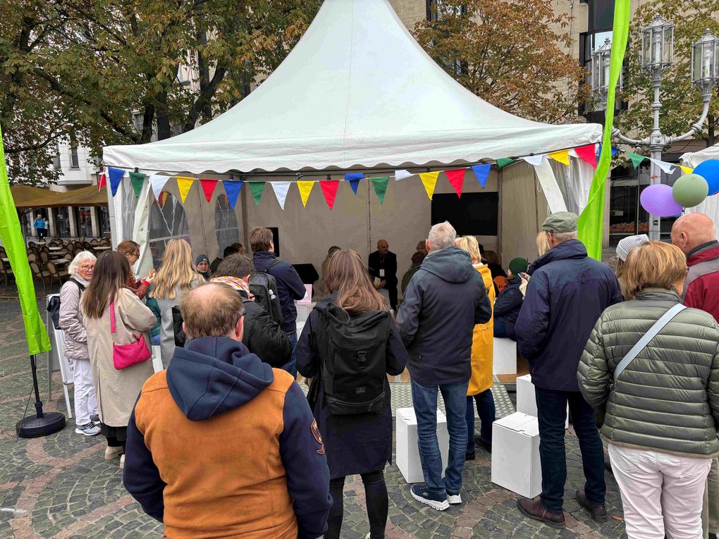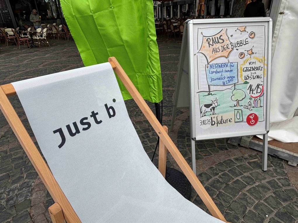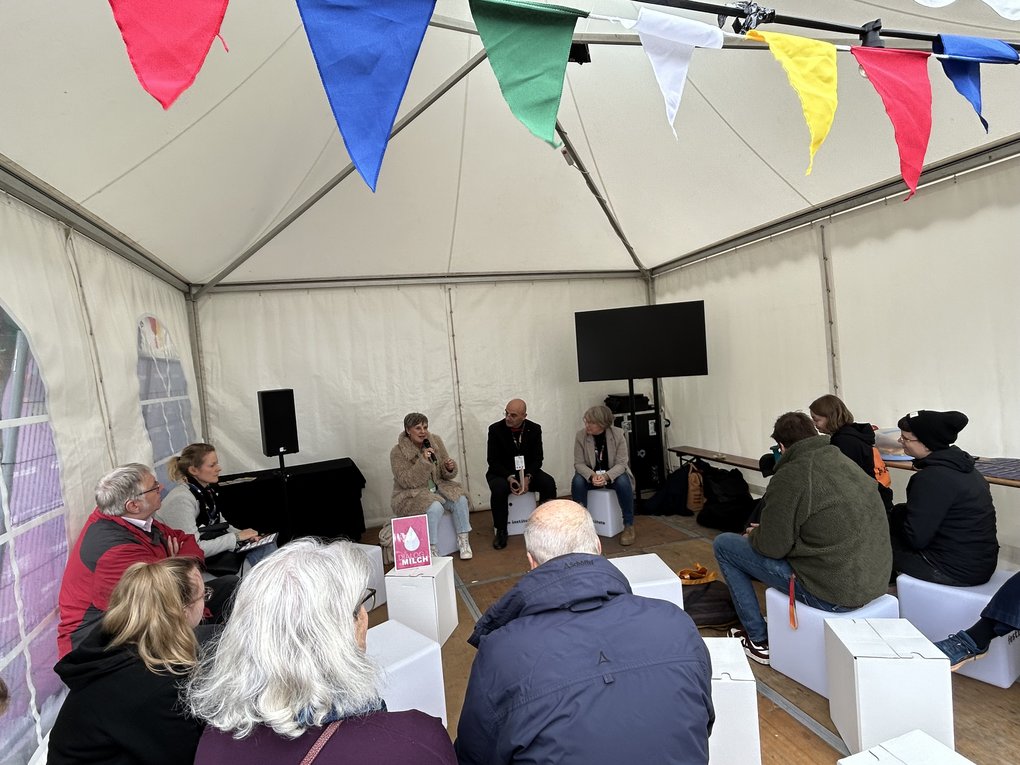 Mit einem Panel-Talk nahm DIALOG MILCH am 3. Oktober am b° future Festival für konstruktiven Journalismus teil. Wie können wir in Zeiten wachsender Unsicherheit gemeinsam Antworten finden? Dazu diskutierten die Präsidentin des Rheinischen Landfrauenverbandes (RLLV) Jutta Kuhles und DJV-NRW Vorsitzende Andrea Hansen auf dem Münsterplatz in Bonn.