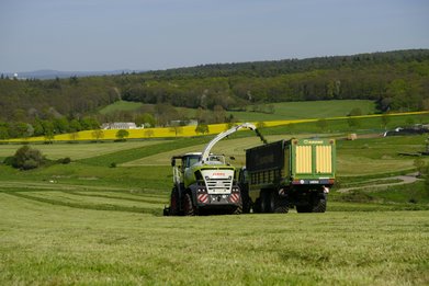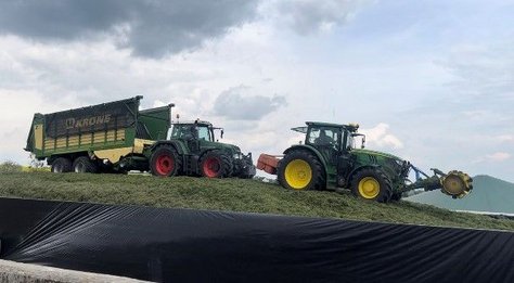 Sobald der richtige Welkegrad erreicht ist, wird das Grünfutter mit einem Feldhäcksler aufgenommen, in möglichst kleine Häckselstücke zerkleinert und auf einen Ladewagen geblasen. Mit dem geht es dann zur Siloplatte, wo das Häckselgut abgeladen und mit schweren Maschinen möglichst ohne Lufteinschluss verdichtet wird. „Um die Grassilage als hochwertiges Futter einzulagern und lange haltbar zu machen, geben wir Siliermittel (wie etwa Milchsäurebakterien) hinzu und bringen so eine Milchsäuregärung in Gang. Dann decken wir das Silo mit Folien luftdicht ab.