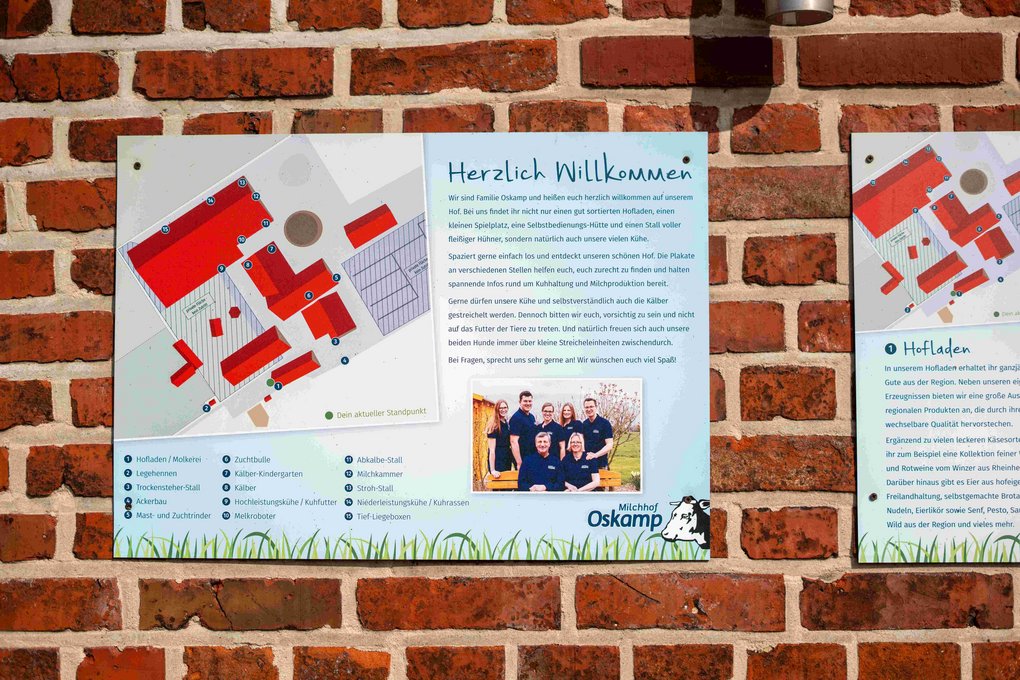 Regionalität, Tierwohl und nachhaltige Landwirtschaft werden für Besucher des Milchhofs Oskamp im münsterländischen Laer einfach und verständlich erklärt. Beim Hofrundgang können Besucher mithilfe der an vielen Stellen auf dem Hof angebrachten Infotafeln lernen und „begreifen“, wie hier Milch erzeugt wird und wie daraus direkt auf dem Hof Käse und Eis hergestellt werden. Familie Oskamp setzt auf Transparenz und will mit ihrem Hofkonzept Landwirtschaft für die Menschen in der Region direkt erlebbar machen.