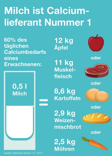 Die Deutsche Gesellschaft für Ernährung (DGE) empfiehlt für den Erwachsenen täglich zwei Portionen Milch und Milchprodukte (1 Portion = 250 ml Milch, 150 g Joghurt oder 30 g Käse). Neben der Nährstoffversorgung wirkt sich diese Verzehrmenge positiv auf die Gesundheit des Menschen aus. So kann das Risiko für die Entstehung von Erkrankungen wie Bluthochdruck, Diabetes mellitus Typ 2 (Alterszucker) sowie Dickdarmkrebs eindeutig gesenkt werden. Dies ergab eine Auswertung einer Reihe von großen wissenschaftlichen Studien zum Thema „Milch und seine Auswirkungen auf den Menschen“ des Bundesforschungsinstituts für Ernährung und Lebensmittel2 im Jahr 2016. Aufgrund ihres hohen Calciumgehaltes (siehe Grafik 2) unterstützt der regelmäßige Konsum von Milch zudem die Knochengesundheit in allen Altersgruppen. Eine hohe Knochendichte kann das Risiko, an Osteoporose zu erkranken, verringern.