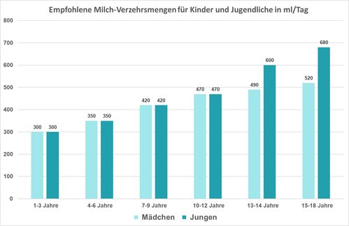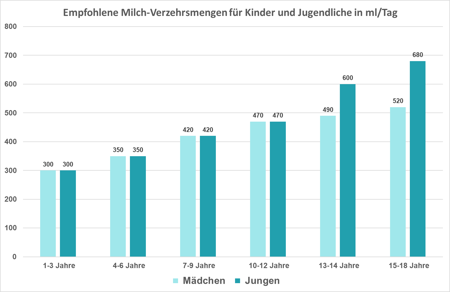 Das Forschungsdepartment Kinderernährung (FKE)3 empfiehlt nach den ersten 4-6 Lebensmonaten von Säuglingen die Beikosteinführung. Als zweite Beikost wird ungefähr im 6. Lebensmonat ein Milch-Getreide-Brei empfohlen, der 200 ml Milch enthält. Mit der Einführung der Familienkost gegen Ende des 1. Lebensjahres geht die Säuglingsernährung nahtlos in die „Optimierte Mischkost“ für Kinder und Jugendliche von 1-18 Jahren über. Die empfohlenen Milchmengen für die verschiedenen Altersgruppen zeigt Grafik 3.