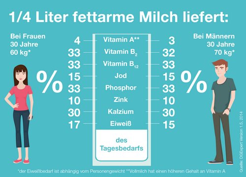 Im Kindesalter bietet Milch alle erforderlichen Nährstoffe für eine optimale Entwicklung. Auch für den Erwachsenen stellt die Milch aufgrund ihrer ausgewogenen Nährstoffzusammensetzung in Kombination mit anderen Lebensmitteln eine vollwertige Ernährung sicher. Milch liefert Energie in Form von Milchzucker und -fett, hochwertiges Eiweiß für den Aufbau von Zellen und Wirkstoffen im Körper sowie zahlreiche lebensnotwendige Vitamine und Mineralstoffe. So stellen Milch und Milchprodukte die Hauptquelle für Vitamin B2 – und Vitamin B12 bei Vegetariern – dar und sind weiterhin eine wichtige Quelle für gut verwertbares Calcium sowie für Jod (siehe Grafik 1).