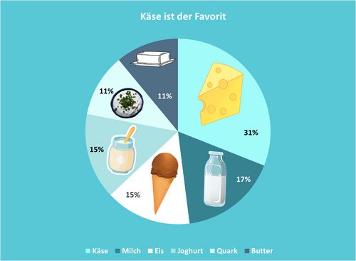 Käse gewann eindeutig mit 31 % der Nennungen, gefolgt von Milch mit 17 %, Eis und Joghurt belegten mit 15 % zusammen den dritten Rang und Quark und Butter bildeten mit jeweils 11 % das Schlusslicht.